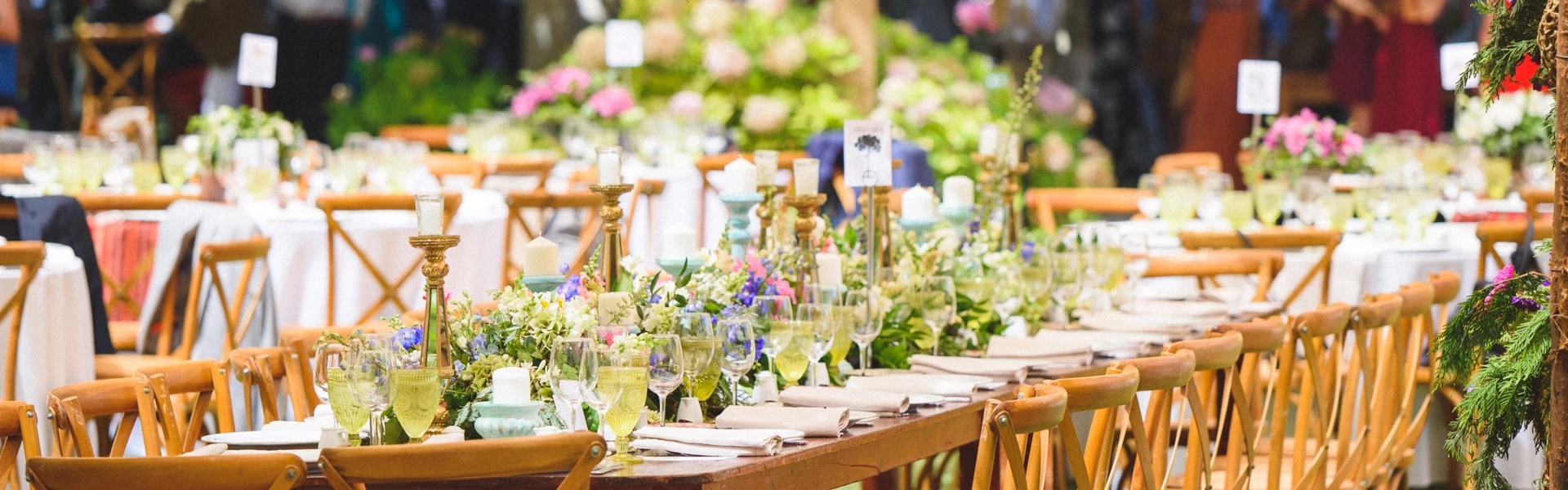 Feestmateriaal: tafels, stoelen, bestek, glazen en meer