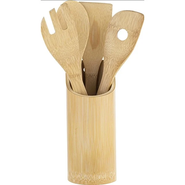 Bamboe houten keukengerei spatel set 4-delig met houder. Handige keukengerei set voor bij het bakken en braden. De set bestaat uit twee spatels, twee lepels en een houder. Afmeting houder: ca. 8 x 22 cm. Afmeting spatels en lepels: ca. 1 x 6 x 31 cm.