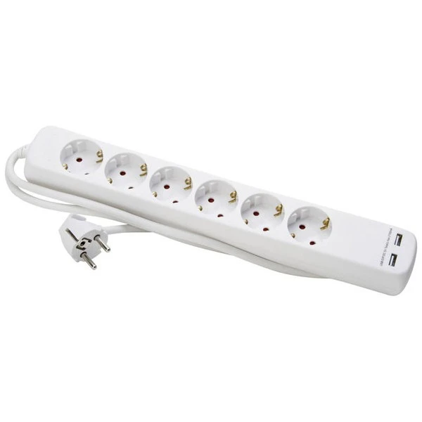 6-voudig tafelcontactdoos met 2 USB aansluitingen 2.100 mA. Voor snel laden van USB-apparaten. Uitermate geschikt voor het laden van een smartphone, tablet-PC, Digitale camera etc. Alleen USB-kabel nodig. Wit met verhoogde beveiliging. 1,4 m aansluitsnoer. 16 A, 250 V~; USB: 5 V, 2.100 mA.