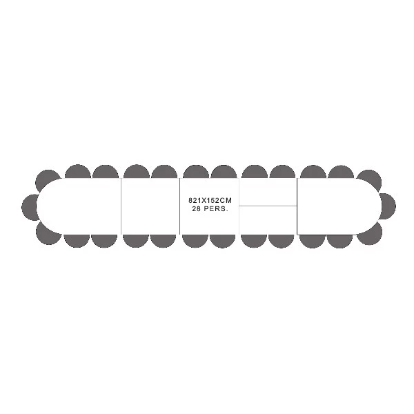 De ovale tafel van 821x152cm biedt voldoende ruimte voor 28 personen en is ideaal voor evenementen, feesten of vergaderingen. Dankzij het praktische, inklapbare ontwerp is deze tafel eenvoudig op te stellen en te transporteren. De tafel bestaat uit telkens 2 halfronde aanzetstukken in combinatie met diverse klaptafels waardoor de maximale transportafmeting per deel 183x76cm bedraagt.