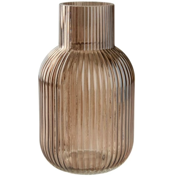 De Geribbelde Vaas Bruin combineert een warme tint met een elegant geribbeld design, perfect voor een stijlvolle en sfeervolle uitstraling. Dankzij de diameter van 12 cm en een hoogte van 21 cm is deze vaas ideaal voor kleine bloemstukken of als decoratief object op tafels. De ronde vorm en verfijnde details maken deze vaas een blikvanger op elk feest of evenement.