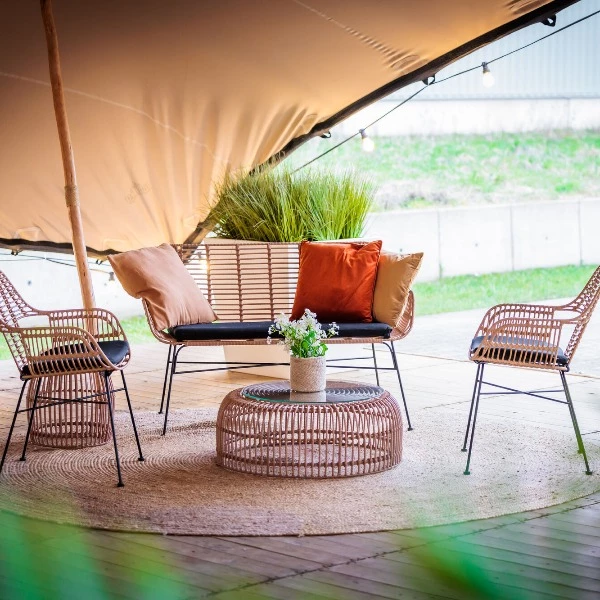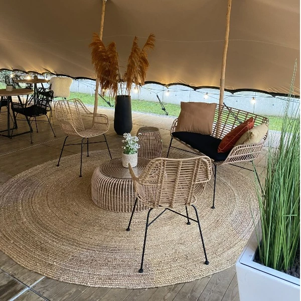 De Palm Salontafel met gehard glazen blad is een elegante en functionele toevoeging aan elke lounge- of feestsetting. Met zijn natuurlijke rotanlook en stevig glazen blad combineert deze tafel een luchtig design met praktische stevigheid. Perfect voor binnen en buiten, ideaal voor lounges, tuinfeesten en trouwfeesten.
