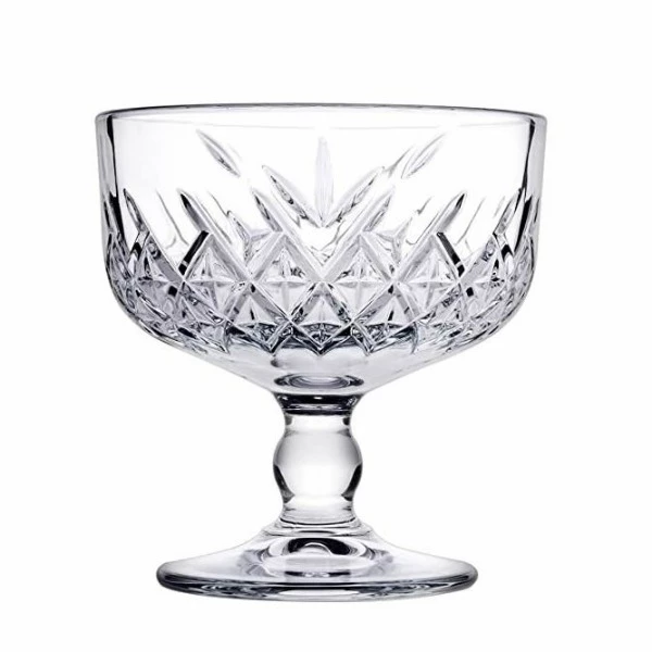 Serveer je desserts met een vleugje klassieke elegantie in de IJscoupe Timeless 31 cl. Dit stijlvolle coupeglas met een verfijnd geslepen patroon straalt luxe en nostalgie uit, perfect voor het presenteren van ijs, desserts, fruit of kleine zoetigheden. Dankzij het tijdloze design en de stevige voet staat het garant voor een stijlvolle en stabiele presentatie.