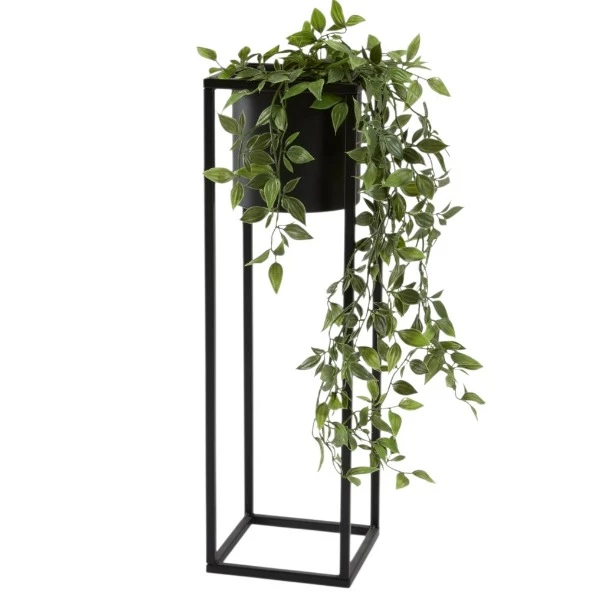 Geef jouw interieur of event een moderne en frisse uitstraling met deze hangplant in een zwarte metalen sokkel. De levensechte, overhangende bladeren brengen direct sfeer, terwijl de strakke zwarte standaard zorgt voor een minimalistische en elegante afwerking. Met een hoogte van 50 cm is dit stuk perfect als stijlvol accent op tafels of buffetten.