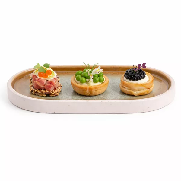 Presenteer je amuses of kleine gerechtjes stijlvol op dit ovale Coco Green schaaltje. De zacht beige rand gecombineerd met de groen gespikkelde binnenzijde zorgt voor een natuurlijke, ambachtelijke uitstraling die perfect past bij zowel moderne als rustieke tafels.