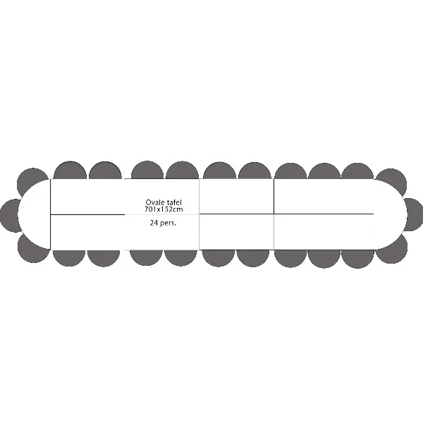 De ovale tafel van 701x152cm biedt voldoende ruimte voor 24 personen en is ideaal voor evenementen, feesten of vergaderingen. Dankzij het praktische, inklapbare ontwerp is deze tafel eenvoudig op te stellen en te transporteren. De tafel bestaat uit telkens 2 halfronde aanzetstukken in combinatie met diverse klaptafels waardoor de maximale transportafmeting per deel 183x76cm bedraagt.